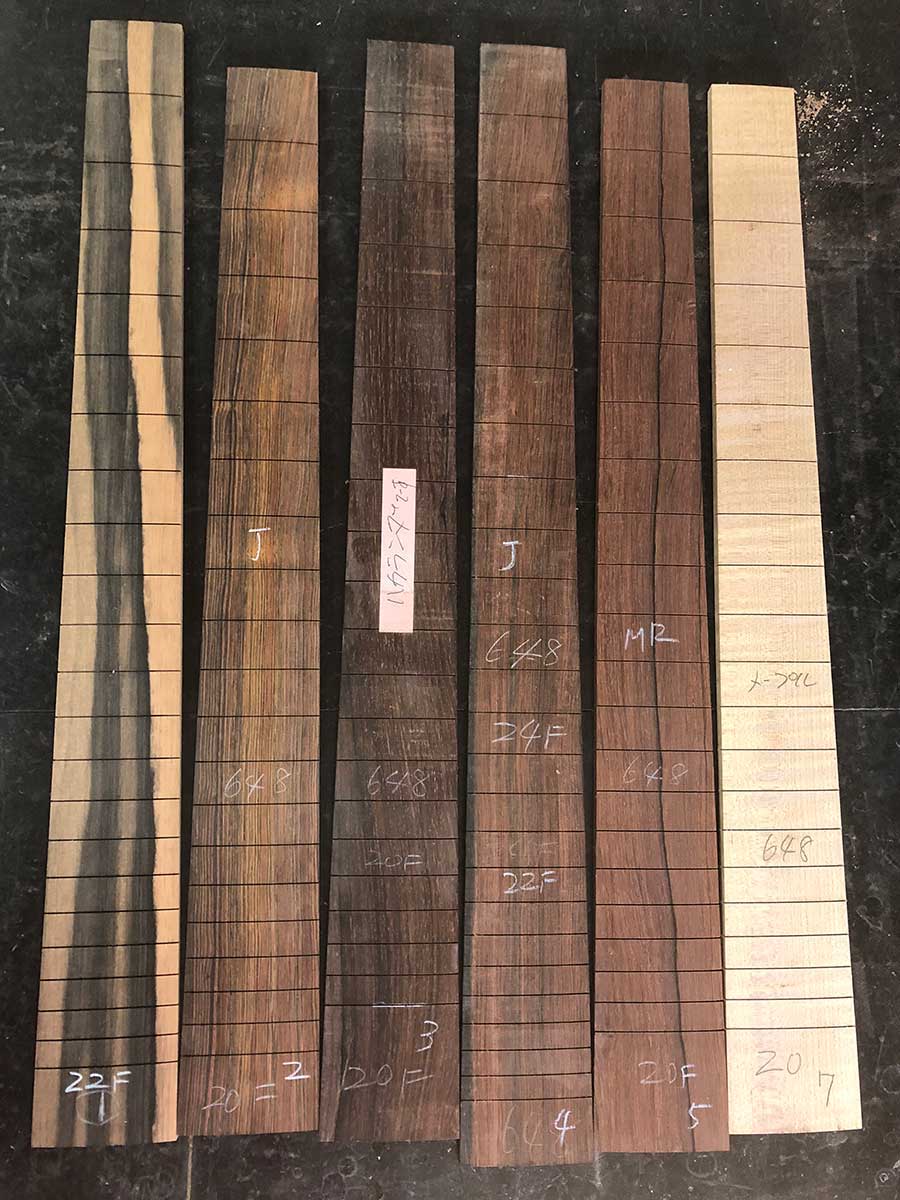 エキゾチックエボニー、ブラジリアンローズウッド、マダガスカルローズウッド、メイプルなどがございます。 フレット数も20 or 22フレットからお選びいただけます。