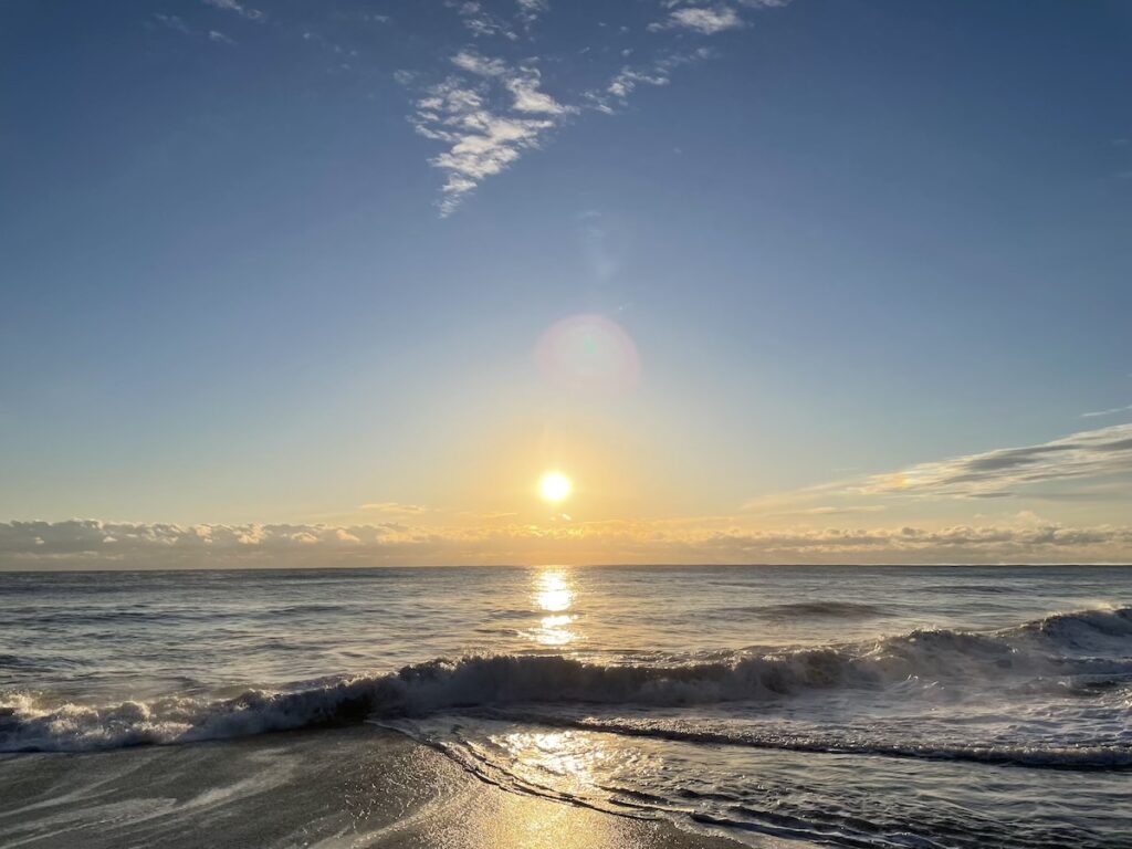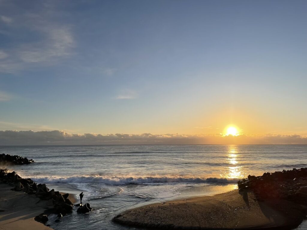 6時過ぎに朝日を撮影しに海岸へ向かうと、海岸に釣り人を発見。朝日とともに画になります。