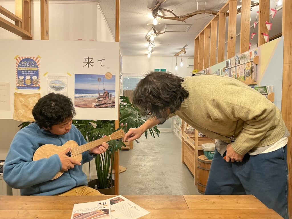 持参したウクレレに興味津々の青木さん。頑張って練習してみましょうね!