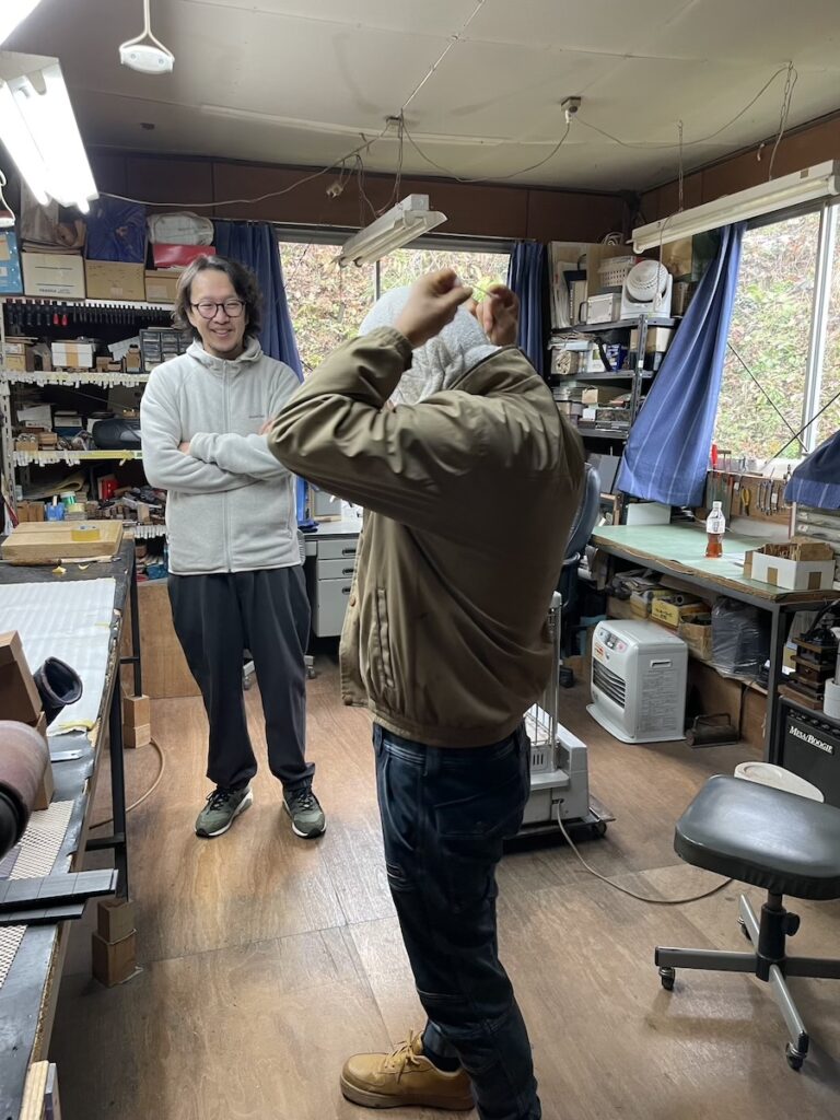 旅行前日にスタッフ全員工房に集合。工房へ到着すると、この時期には珍しく雪が薄ら積もっています。寒さのため、さらさらのパウダースノーです。ようやく冬の到来です。