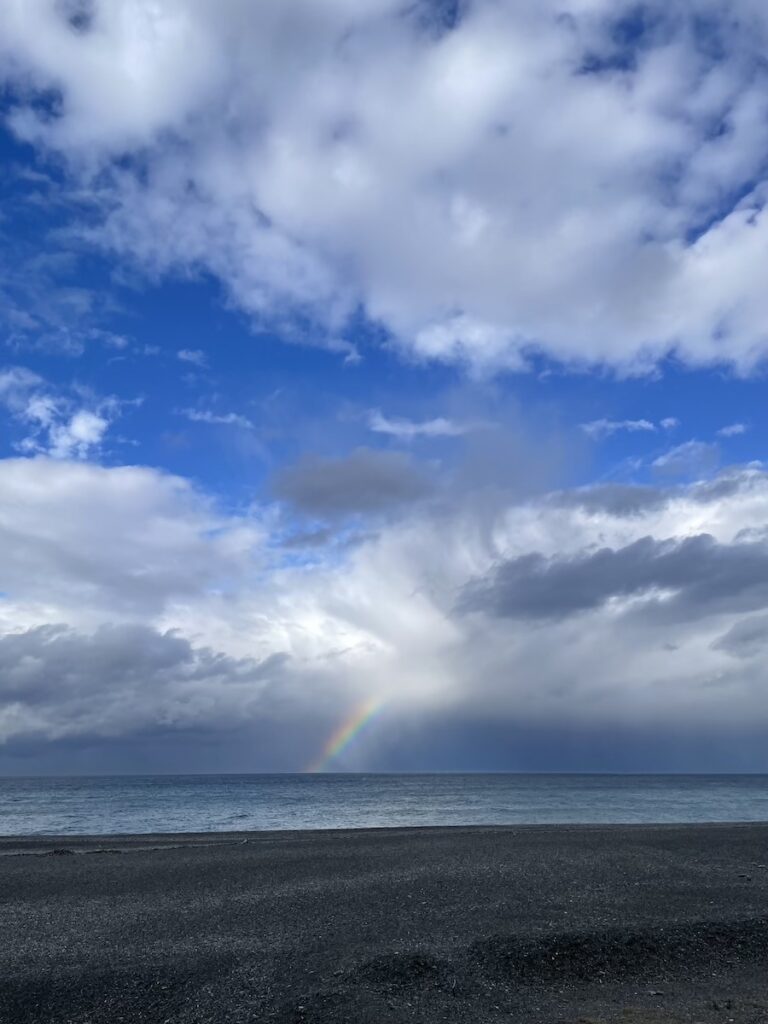 途中、親不知ピアパークで虹が見えましたよ!青空が見えたり、小雨が降ったりと不安定な天気ですが、雪もなくとても暖かい日本海側です。