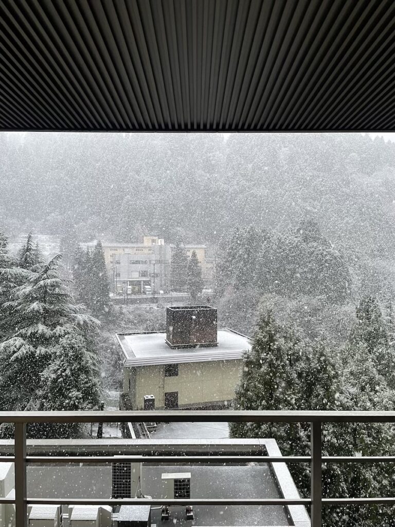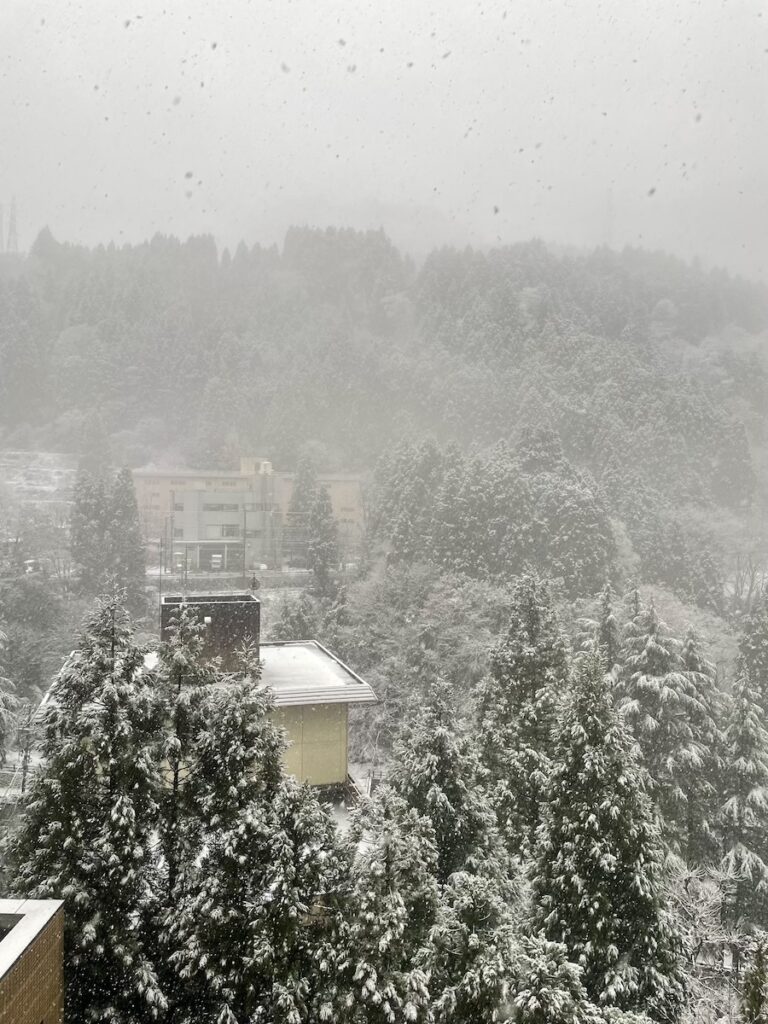 翌朝、目が覚めると外の景色が一変。雨予報だった宇奈月は、雪の宇奈月へと変わっていました。