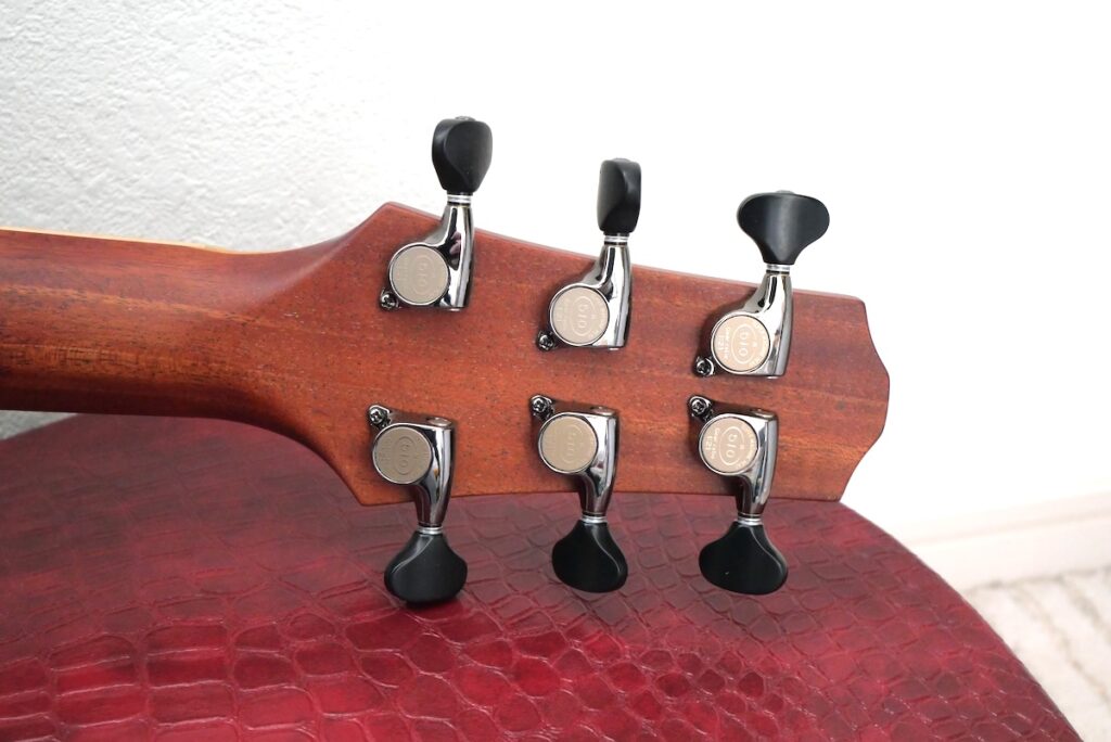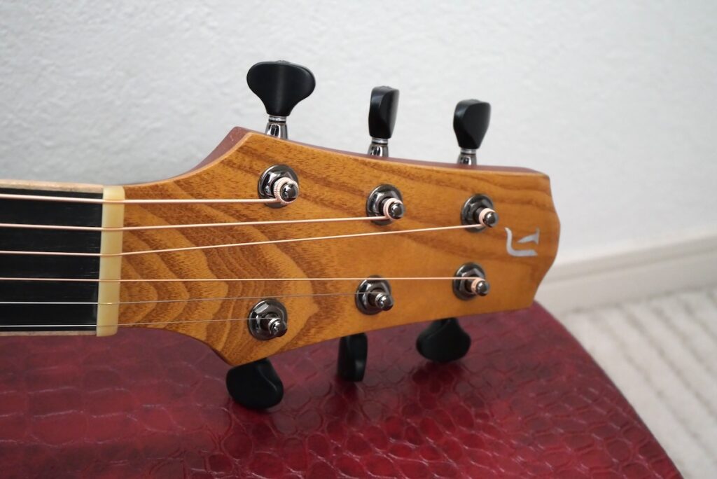 指板&ブリッジ駒にはエボニー、バインディングにはメイプル、ヘッドトップ&ロゼッタには桑材を採用しています。