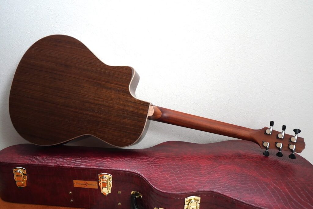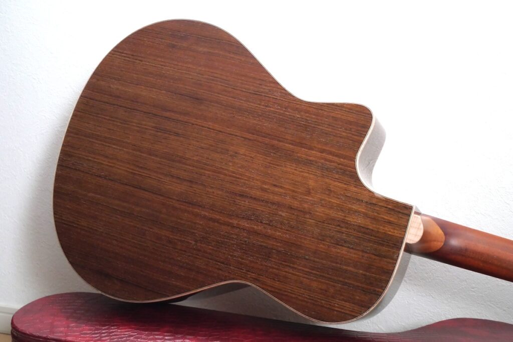 硬さや材料の雰囲気はインディアンローズウッドに似ていますが、少しローがすっきりとした印象で、もたらずに、とても弾きやすいトーンが印象的です。材料の杢目や色味もとても魅力的です。
