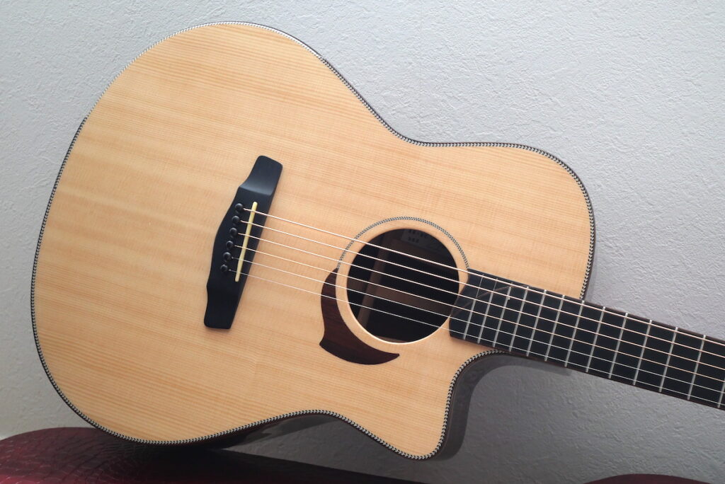 カマティロとも相性が良く、柔らかなサウンドを持つホワイトスプルースをトップに採用し、バックのカマティロは4ピース材をチョイスしています。柔らかいタッチでもボリューム感のあるサウンドが魅力的です。