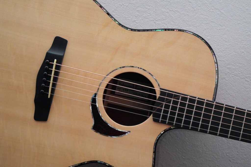 横山氏の手により、ヘッド、ボディトップに美しいアバロンパーフリングが施されています。横山氏は、アバロンパーフリングに入ったモデルをあまり製作しませんが、今回のモデルは特別仕様です。