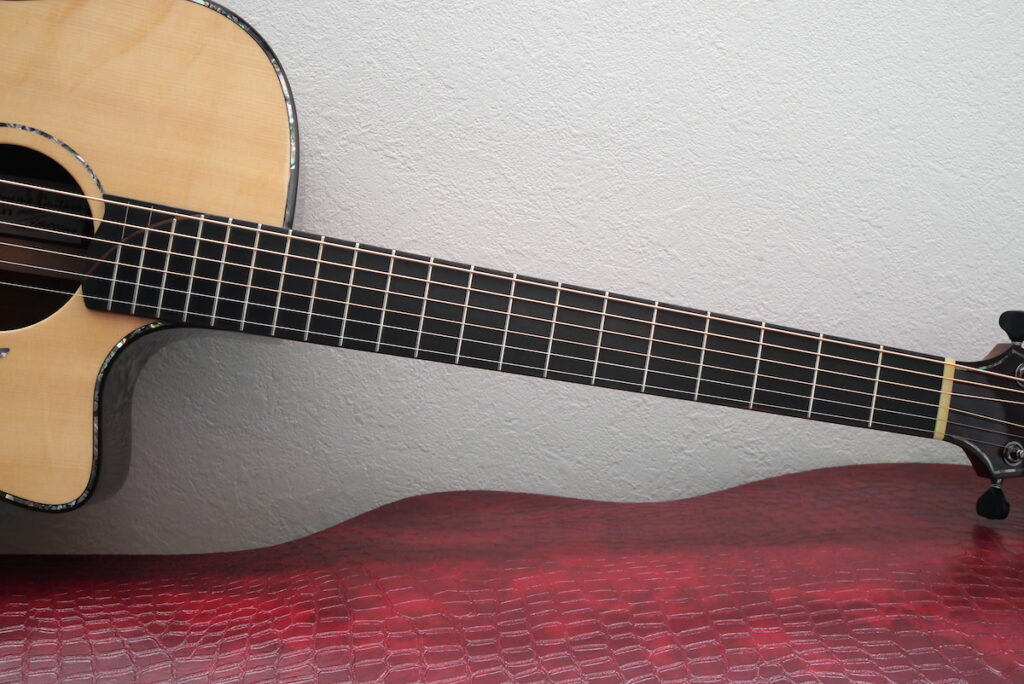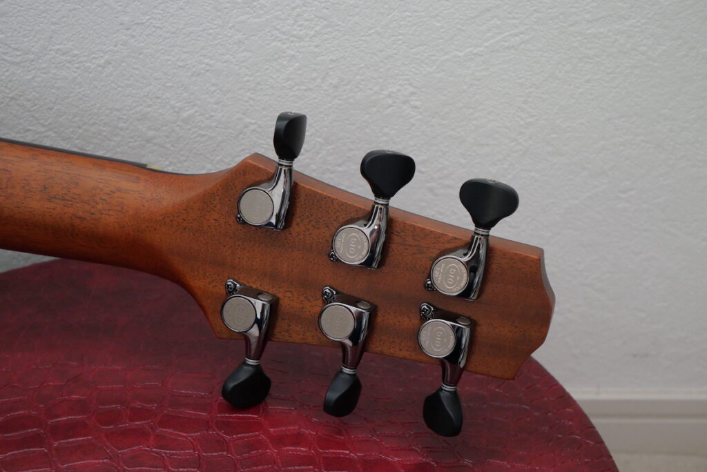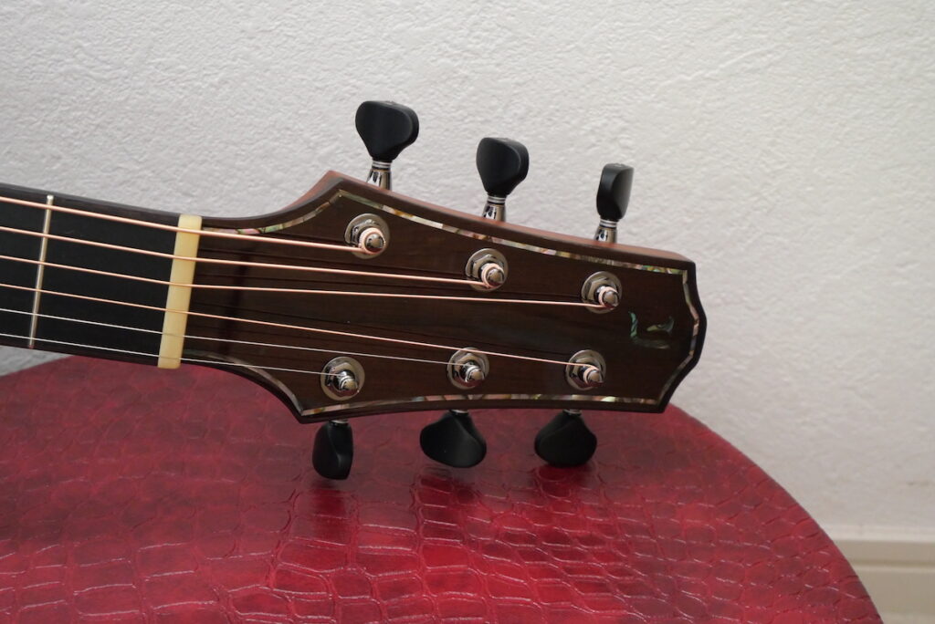 ヘッドトップ、ボディロゼッタにもマダガスカルローズウッドをセレクトし、ネックにはもちろんホンジュラスマホガニーの一本竿を採用しています。サウンドの要ともいえるネック材は、やはりホンジュラスマホガニーですね。とても贅沢な材料選定です。
