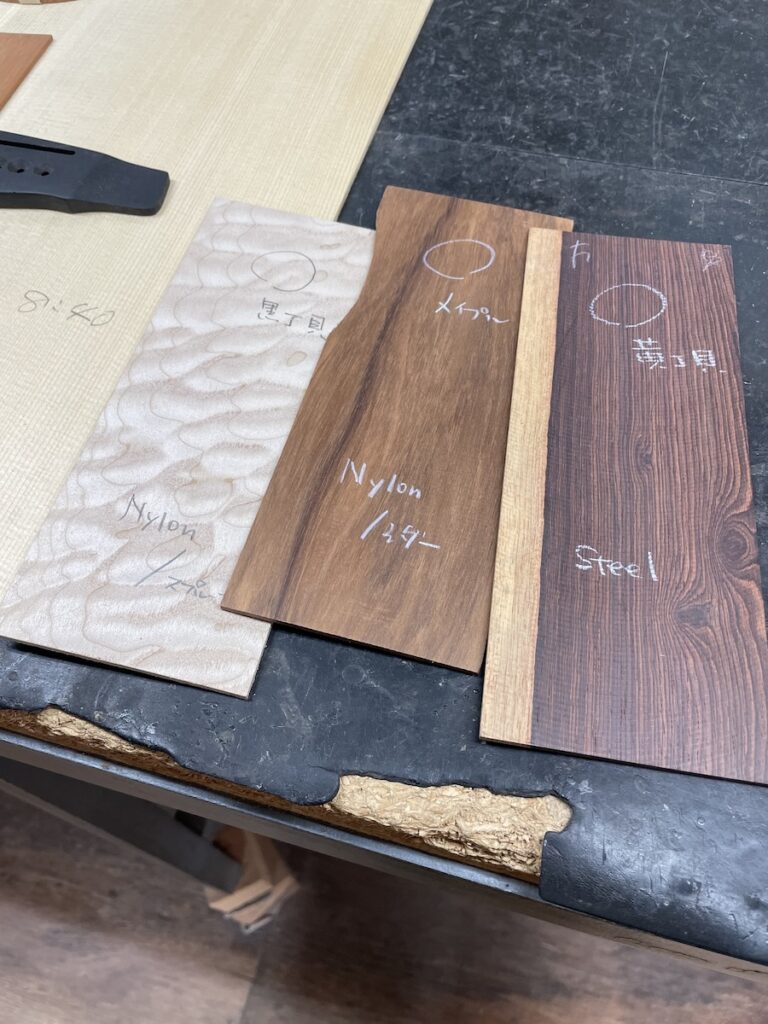 選定したカマティロ、ホンジュラスマホガニー以外にも、和材を用いたモデルも同時に製作いたします。