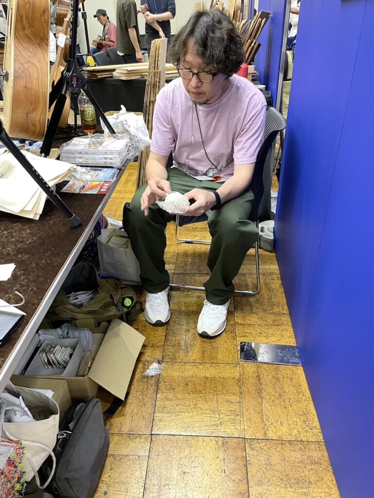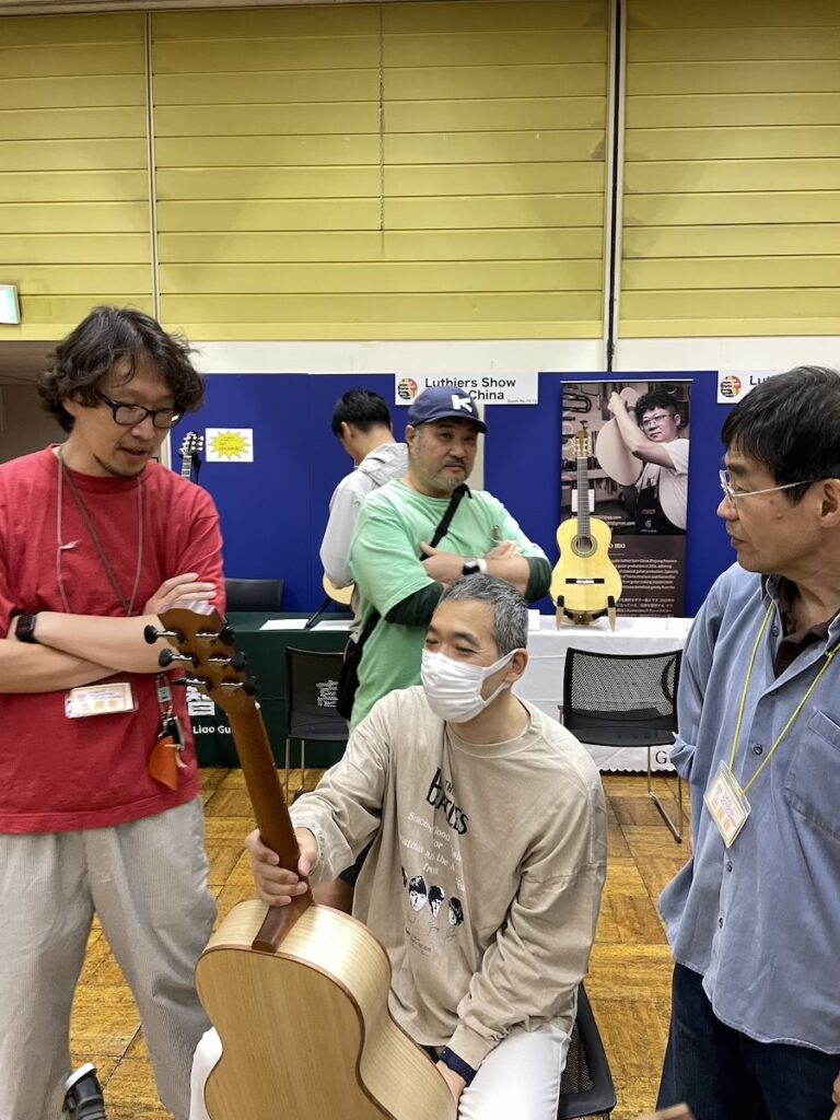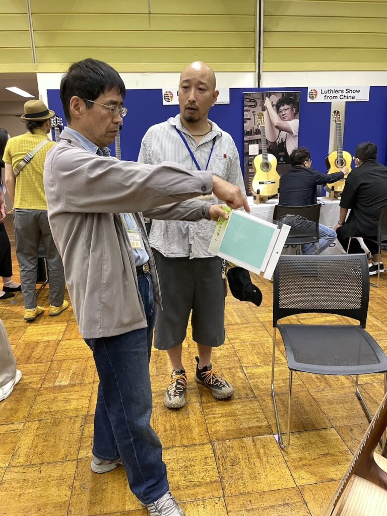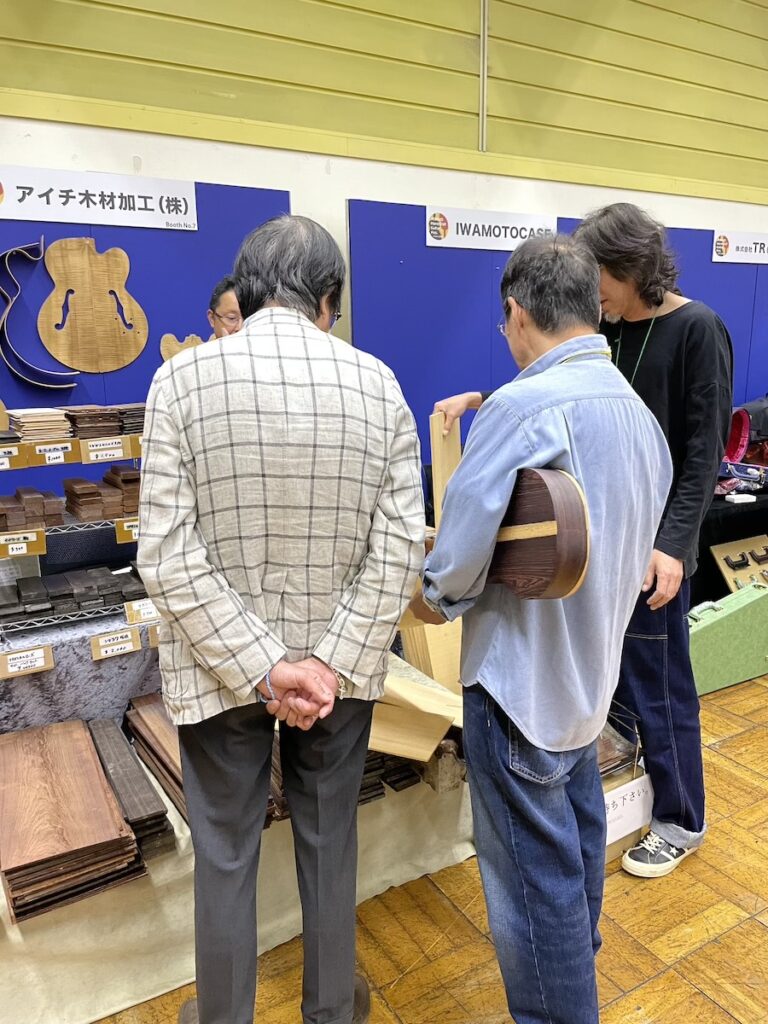 時間がある時に、製作者同士の情報交換タイム。皆さん、和材の話題で持ちきりでした。やはり珍しい材料ですから、この機会に音もチェックしていただきました。