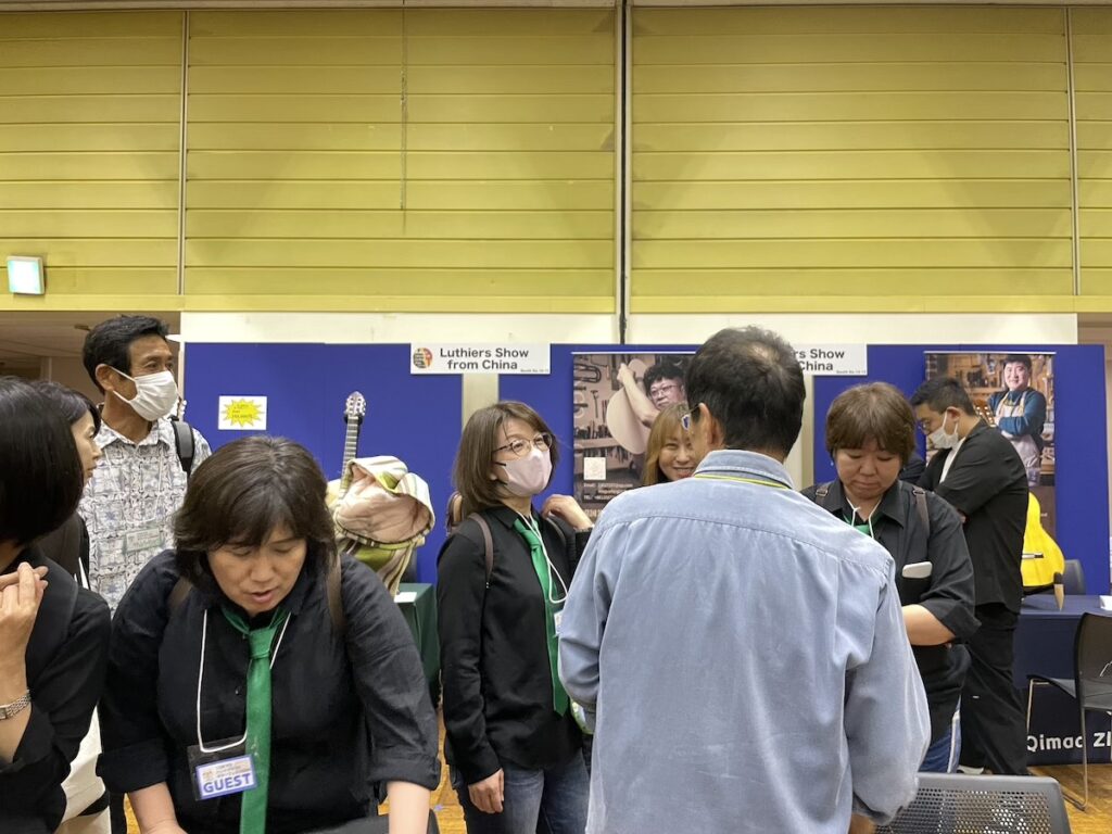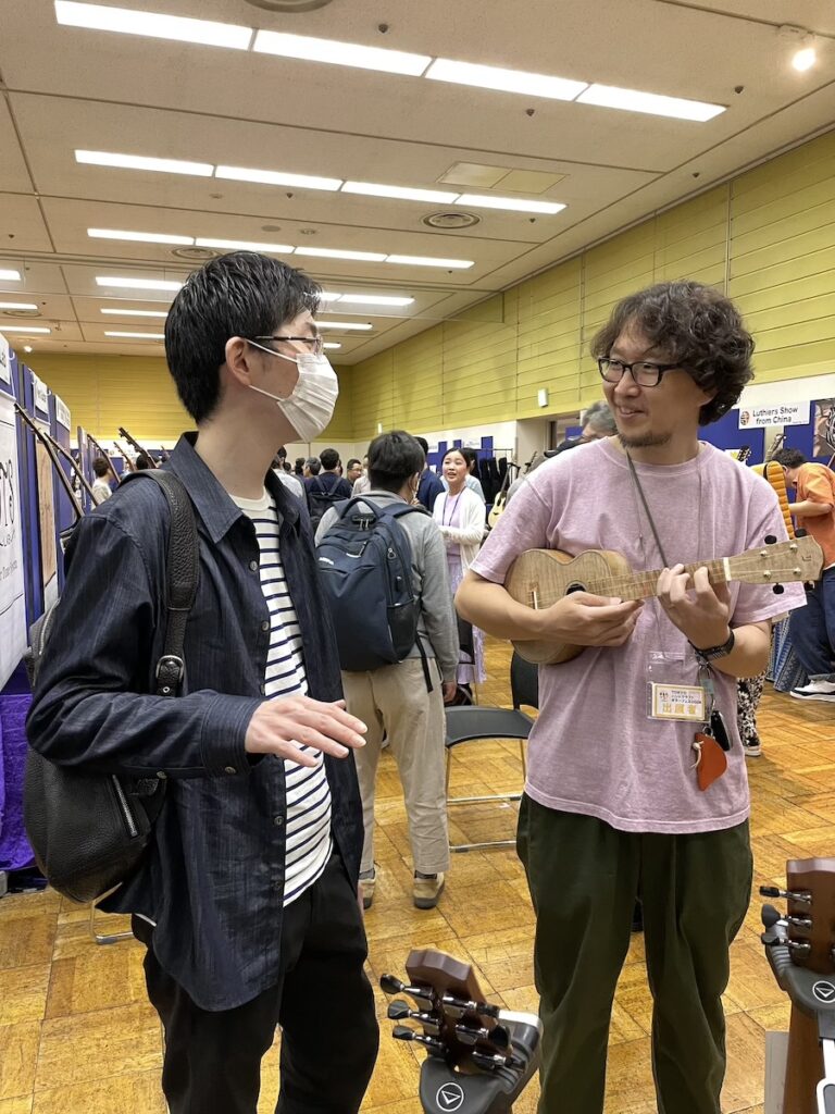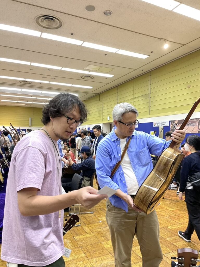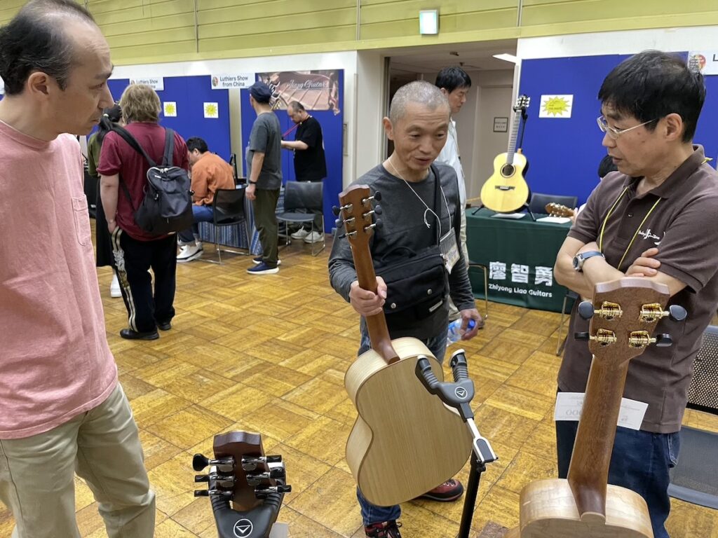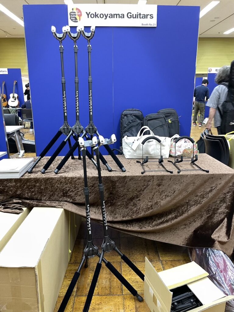 参加の皆さまが、演奏前に各ブースへ大集合です。Yokoyama Guitarsブースには昨年ご購入いただいたお客様が、愛機を抱えてご来場くださいました。