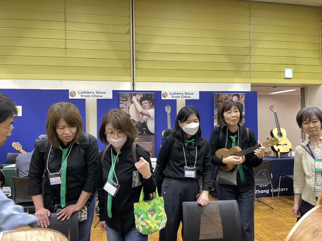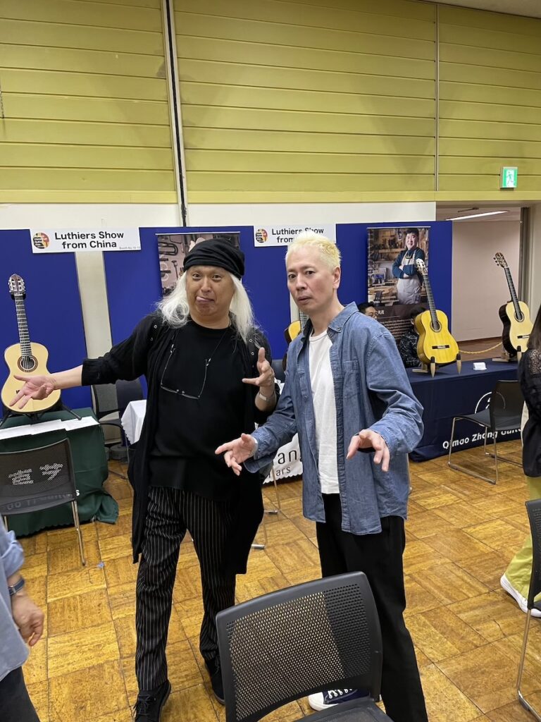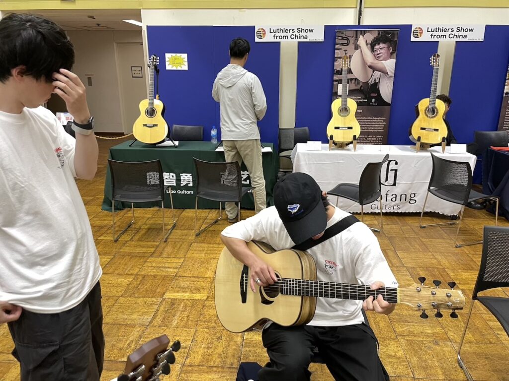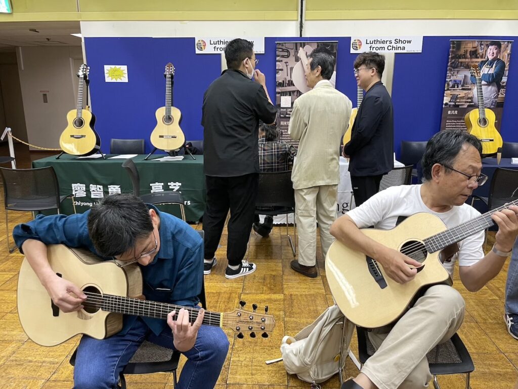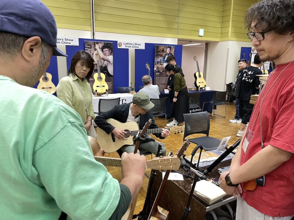 参加の皆さまが、演奏前に各ブースへ大集合です。Yokoyama Guitarsブースには昨年ご購入いただいたお客様が、愛機を抱えてご来場くださいました。