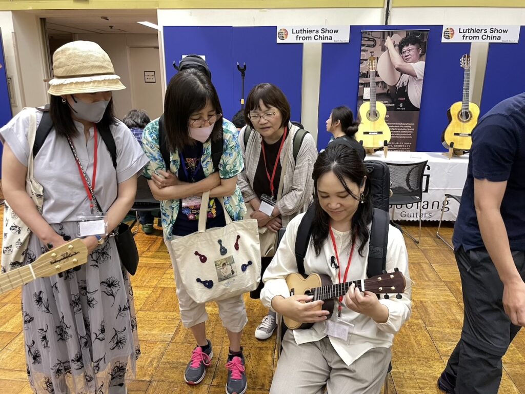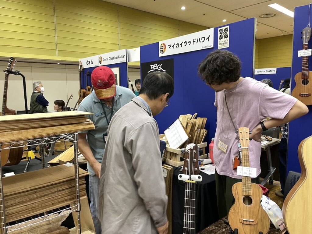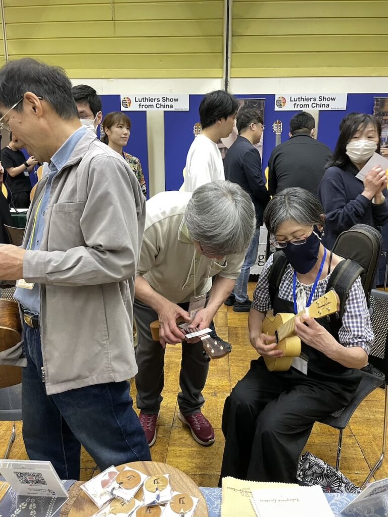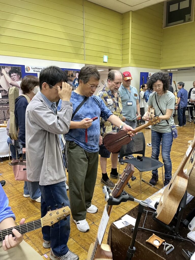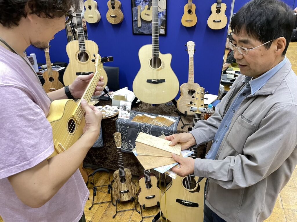 今回も天気が良いので、開場と同時にどどっとお客様のご来場です。賑やかなイベントで、とても楽しいですね。皆さま、和材のギター&ウクレレに興味を持っていただき、お試しいただいています。