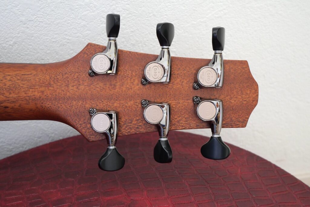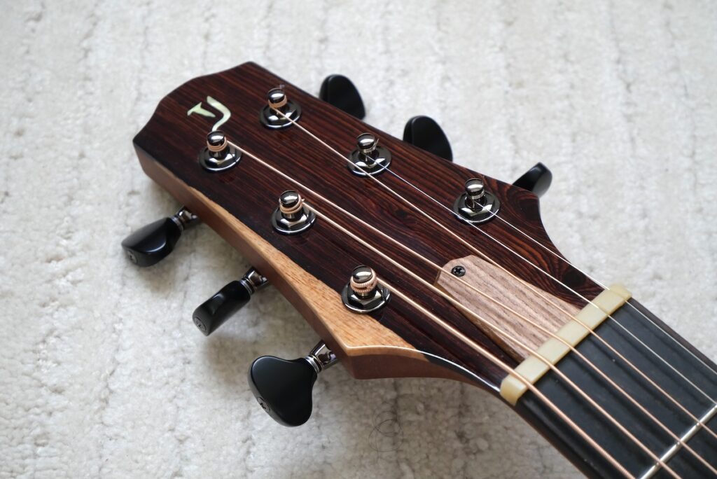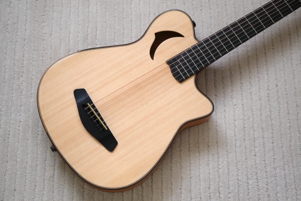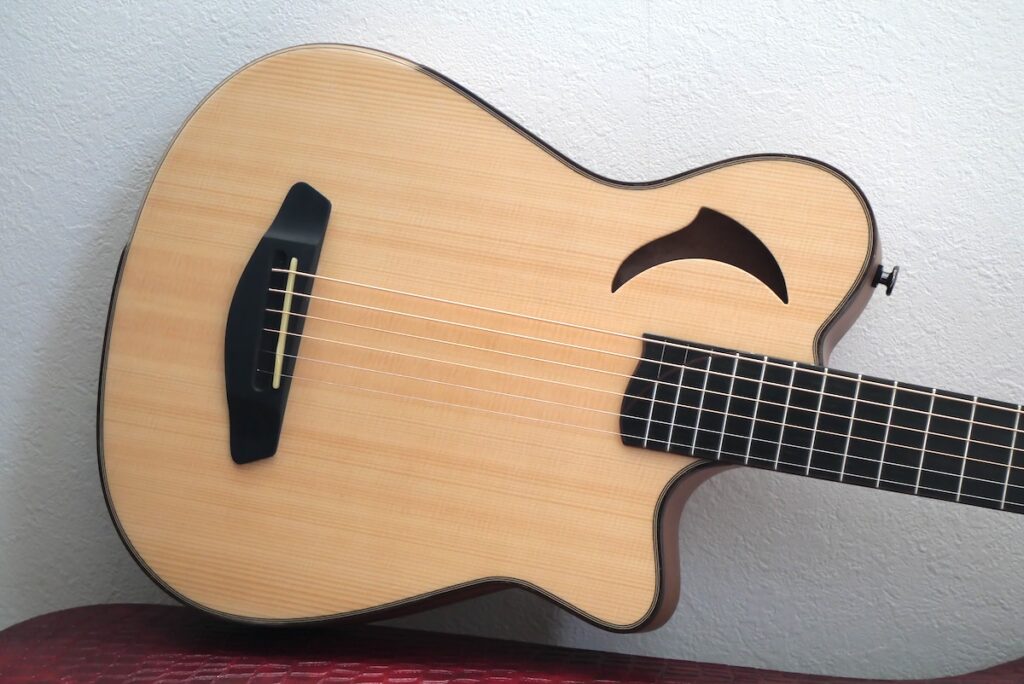 コンセプトは、「コンパクトなアコースティックギター」。チェンバードボディを採用し、ネックまわりのプレイアビリティは、普段製作している「Yokoyama Guitars」同様のスケール、ナット幅を採用。ヘッド形状、ネックグリップも同じに仕上げてあります。