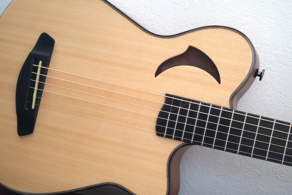 そもそも「 Leaf-Quiet 」は、お客様のリクエストから生まれたモデル。「自宅で夜練習するときに、弾き心地の良いギターが欲しい」ということで、当時製作していたエレクトリックモデルのLeafを改良して製作しました。