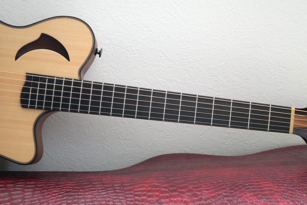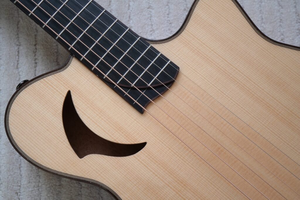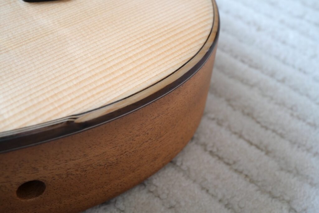 今回製作にあたり、一番気にしたのは全体のボディ厚。もう少し箱鳴り感が欲しいと思い、厚胴を採用しました。